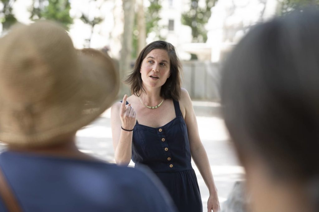 Pour commencer, parlons technique. Le travail d’une comédienne, est d’incarner des personnages. Au théâtre, au cinéma, des hommes et des femmes jouent le rôle de quelqu’un d’autre, prétendent être une autre personne, un personnage. Dans une visite guidée, on peut imaginer par exemple une guide jouant le rôle d’une marquise du 18e siècle ayant vécu dans le château que l’on fait visiter, ou bien une lavandière travaillant dans la rue dans laquelle passe la visite. Il s’agit dans ce cas d’être le personnage, marcher comme lui, parler comme lui, jouer le rôle pleinement.